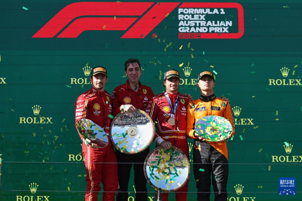 3月24日,法拉利车队西班牙车手塞恩斯(左一)、法拉利车队摩纳哥车手勒克莱尔(右二)和迈凯伦车队英国车手诺里斯(右一)在颁奖典礼上。新华社发(钱俊摄)