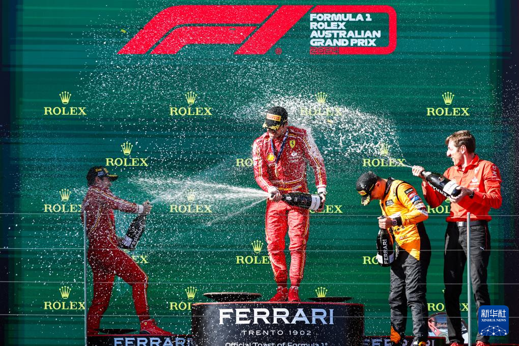 3月24日,法拉利车队西班牙车手塞恩斯(左二)、法拉利车队摩纳哥车手勒克莱尔(左一)和迈凯伦车队英国车手诺里斯(右二)喷香槟庆祝。新华社发(钱俊摄)