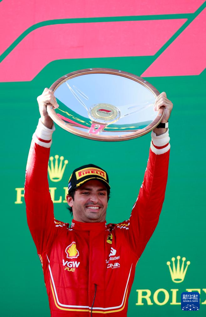 3月24日,法拉利车队西班牙车手塞恩斯在颁奖典礼上。新华社记者 马平 摄