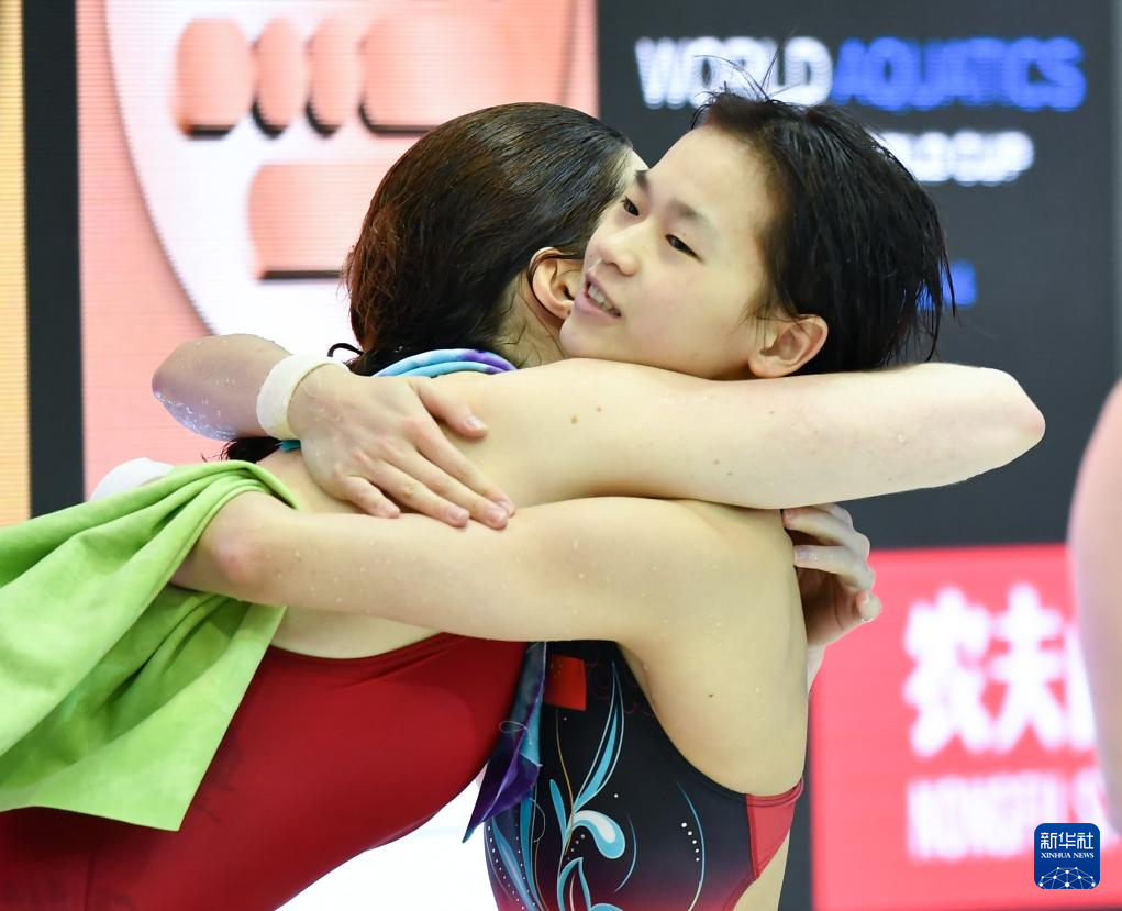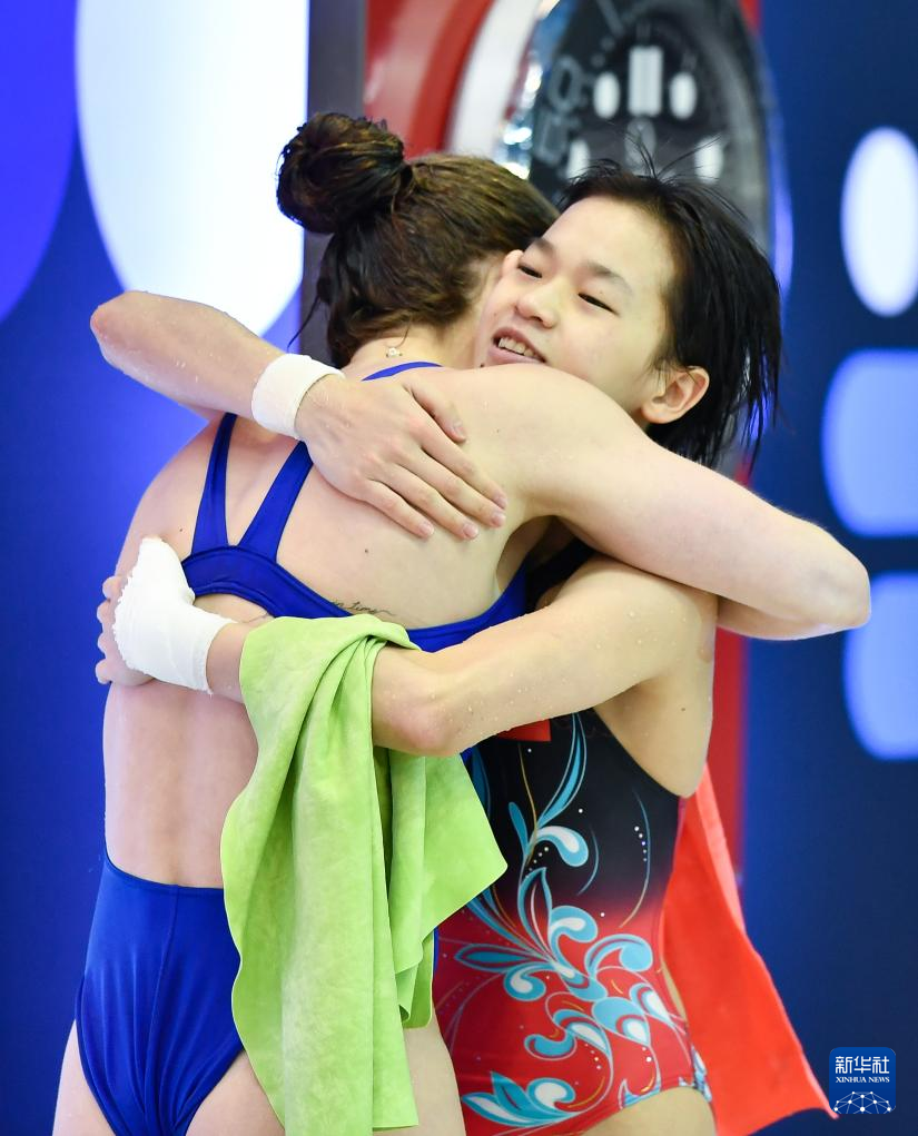 3月24日,全红婵(右)夺冠后接受亚军英国选手斯彭多利尼·西里埃祝贺。新华社记者 任鹏飞 摄