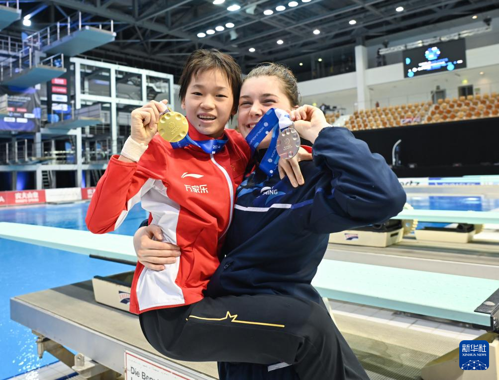 3月24日,冠军中国选手全红婵(左)和亚军英国选手斯彭多利尼·西里埃在颁奖仪式后展合影。新华社记者 任鹏飞 摄