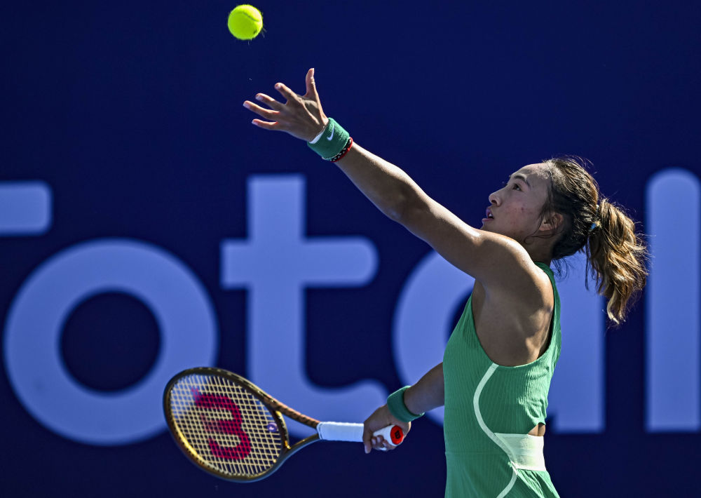 2月13日,郑钦文在比赛中发球。当日,在女子网球协会(WTA)多哈站单打第二轮比赛中,中国选手郑钦文2比1战胜波兰选手琳内特,晋级16强。新华社发(尼库 摄)