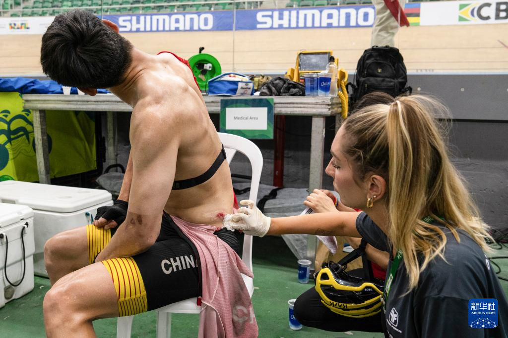 3月24日,中国选手梁伟聪(左)在男子C1级捕捉赛后接受治疗。新华社记者 王天聪 摄