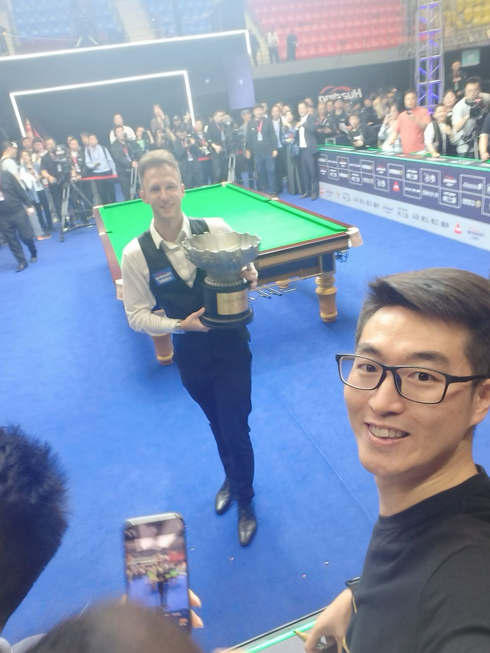 在24日晚特鲁姆普举起奖杯庆祝的时刻,看台上的王燕强举起手机,和冠军来了一张“自拍”。他和妻子张晓周五晚从北京出发抵达江西,周六见证丁俊晖闯入决赛,还在周日白天“快闪”了一波婺源。玉山台球赛事的举办,为上饶市的旅游版图添上新的热点。