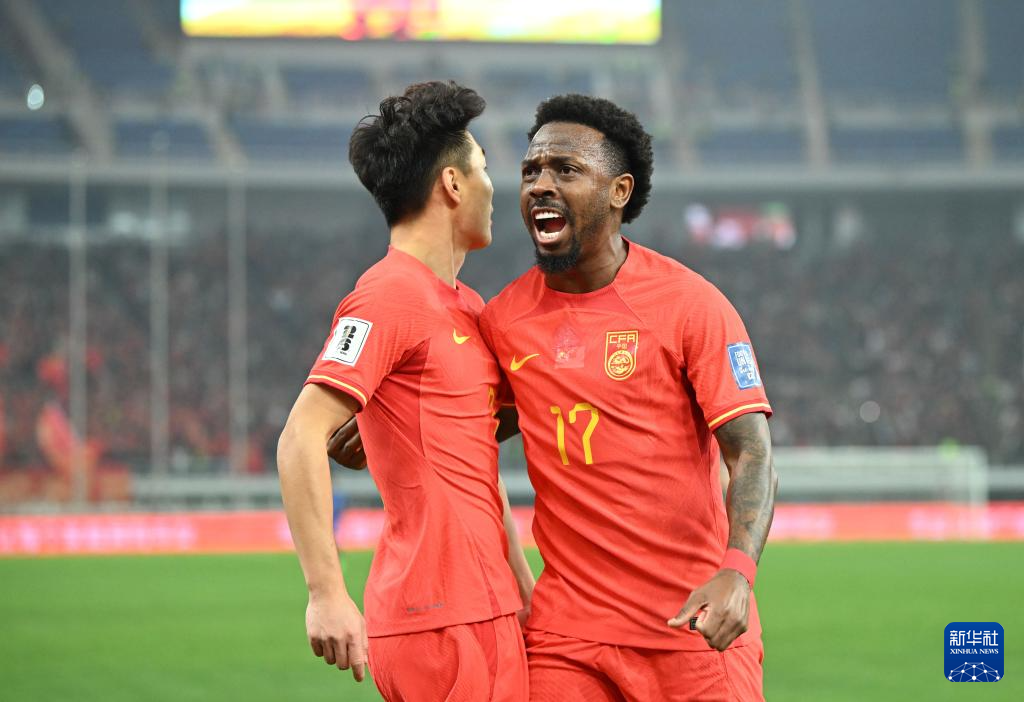 3月26日,中国队球员武磊(左)进球后与队友费南多庆祝。新华社记者 孙凡越 摄