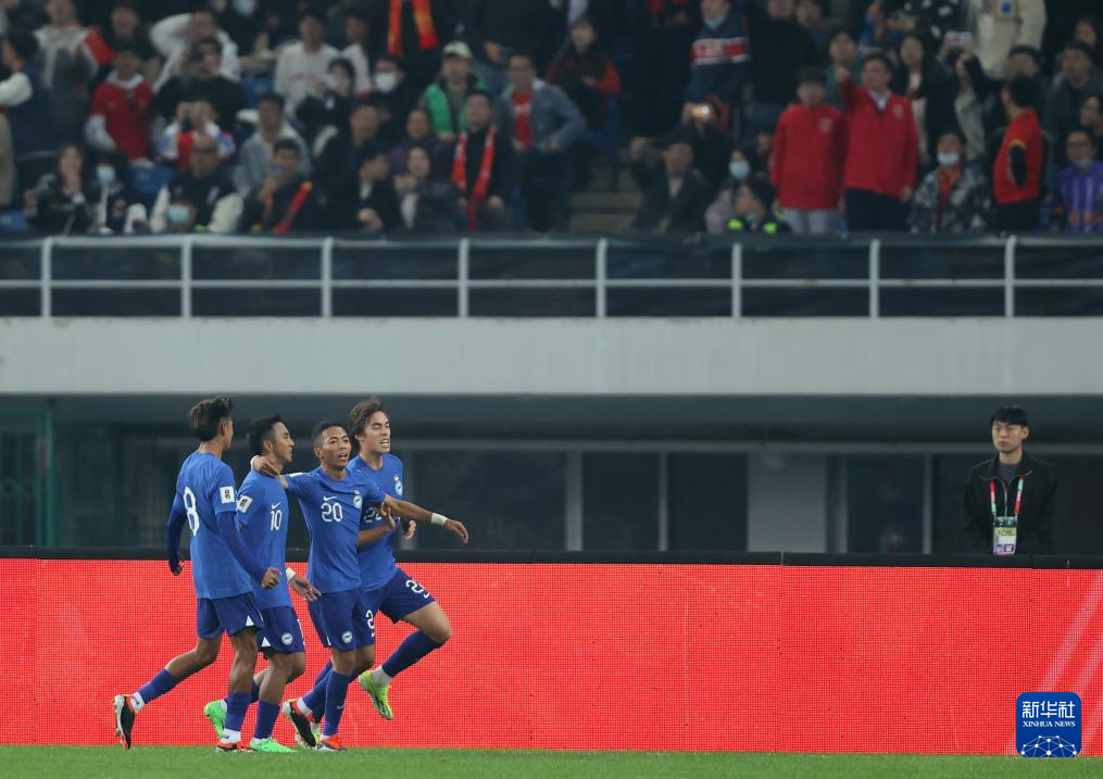 3月26日,新加坡队球员拉姆利(左二)进球后与队友庆祝。新华社记者 贾浩成 摄