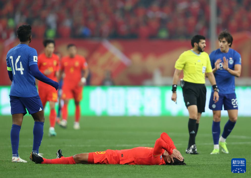 3月26日,中国队球员张玉宁(下)在被犯规后。新华社记者 贾浩成 摄