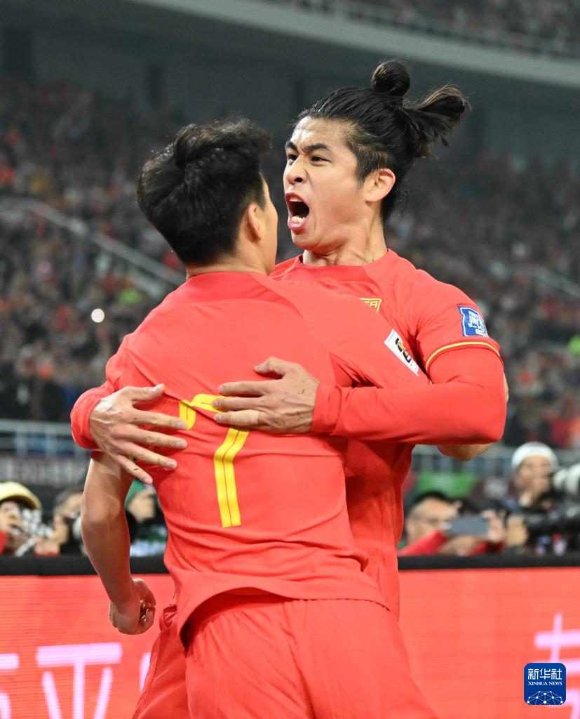 3月26日,中国队球员张玉宁(前左)与武磊庆祝球队得分。新华社记者 孙凡越 摄