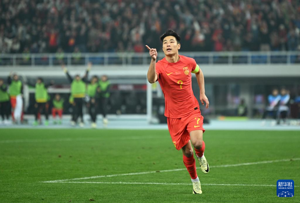 3月26日,中国队球员武磊在进球后庆祝。新华社记者 孙凡越 摄