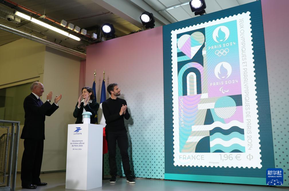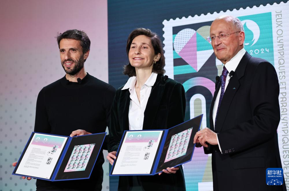 3月26日,法国邮政集团总裁菲利普·瓦尔、法国体育部长卡斯特拉、巴黎奥组委主席托尼·埃斯坦盖(从左至右)揭晓巴黎奥运会及残奥会官方邮票。新华社记者 高静 摄