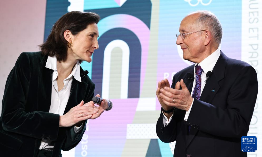 3月26日,巴黎奥组委主席托尼·埃斯坦盖(左)、法国体育部长卡斯特拉出席巴黎奥运会及残奥会官方邮票发布会。新华社记者 高静 摄