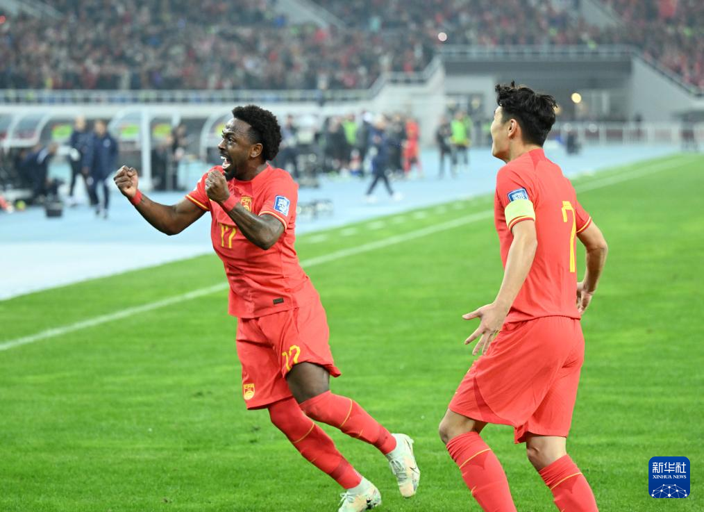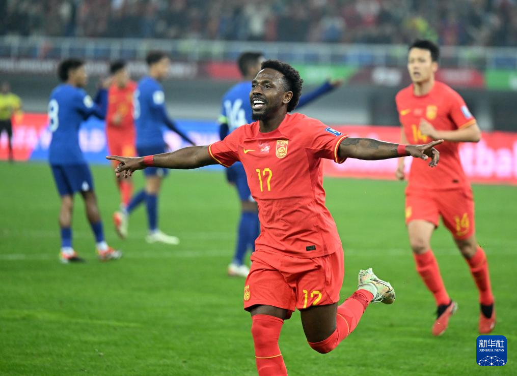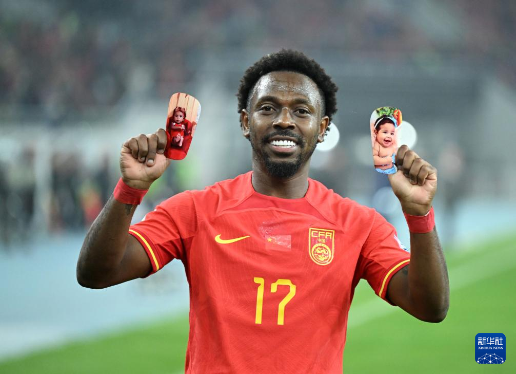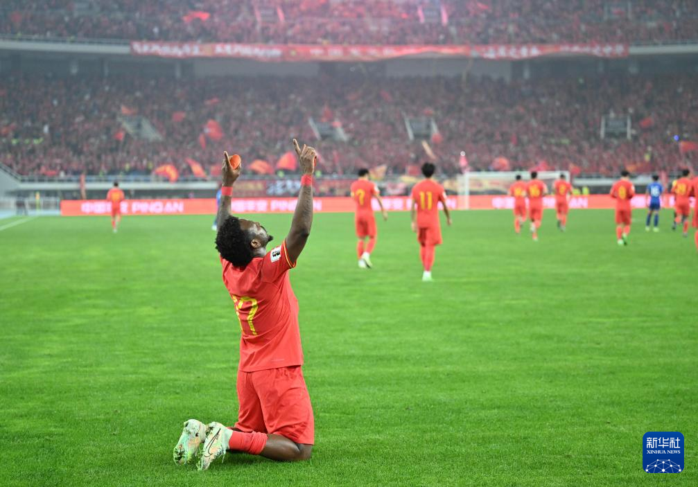 3月26日,中国队球员费南多在进球后庆祝。新华社记者 赵子硕 摄