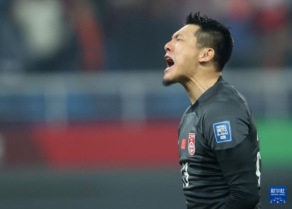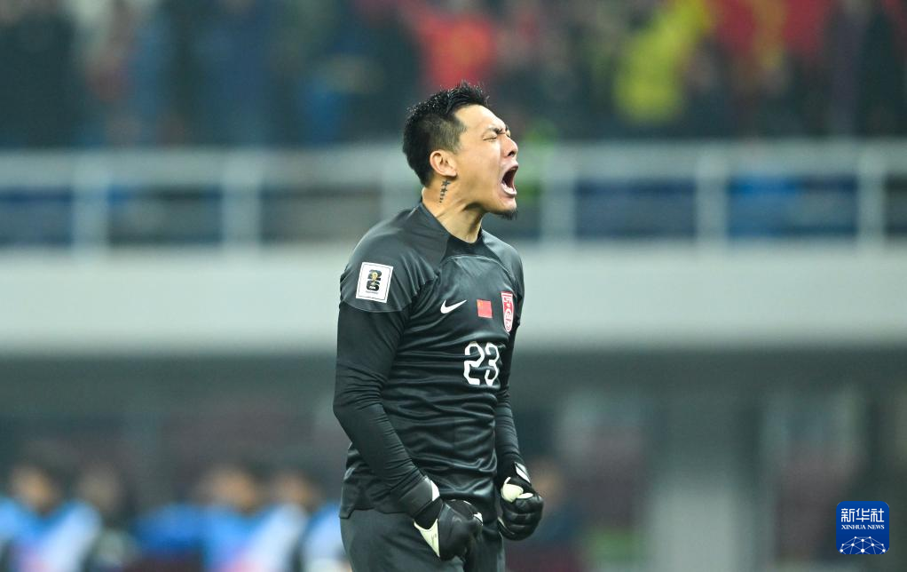 3月26日,中国队守门员王大雷在比赛中庆祝。新华社记者 孙凡越 摄