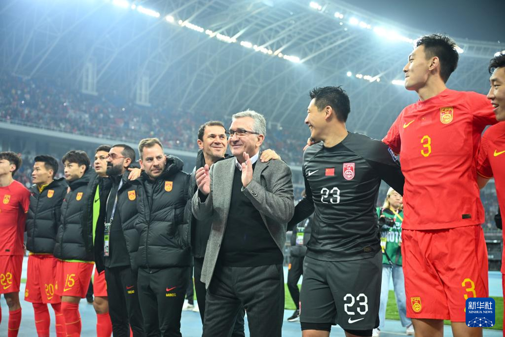 3月26日,中国队主教练伊万科维奇(右四)与队员庆祝比赛胜利。新华社记者 孙凡越 摄