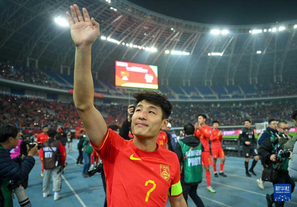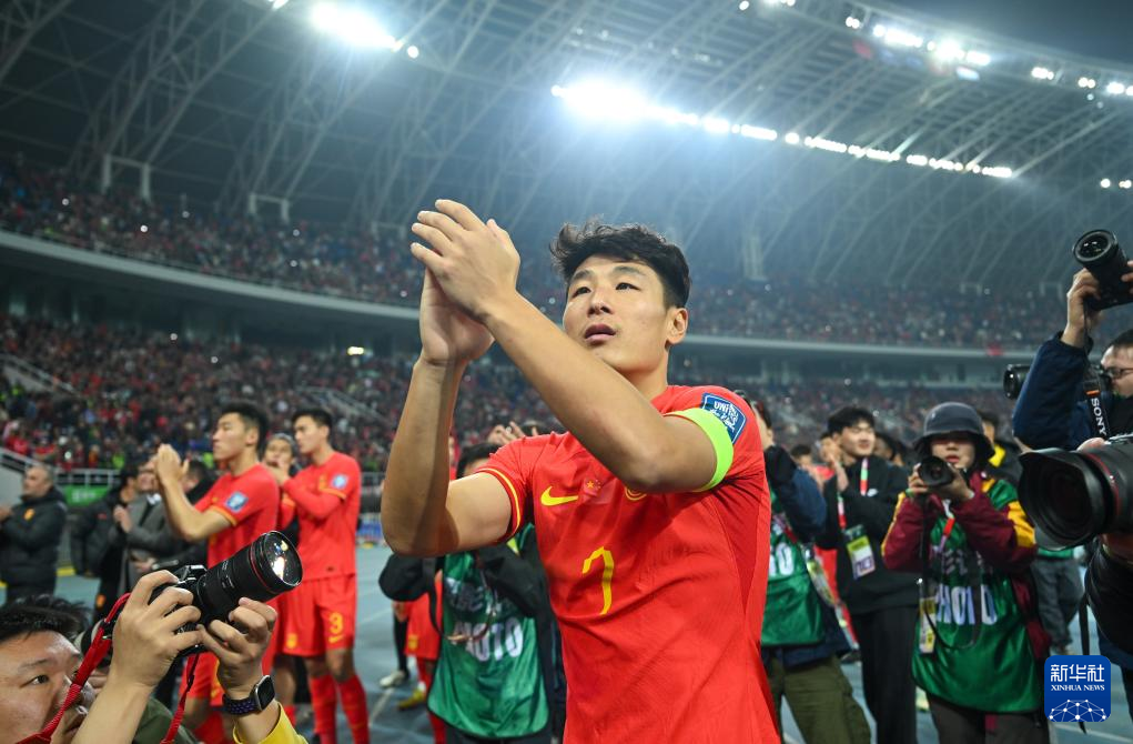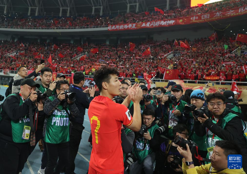 3月26日,中国队球员武磊(中)赛后向球迷致意。新华社记者 贾浩成 摄