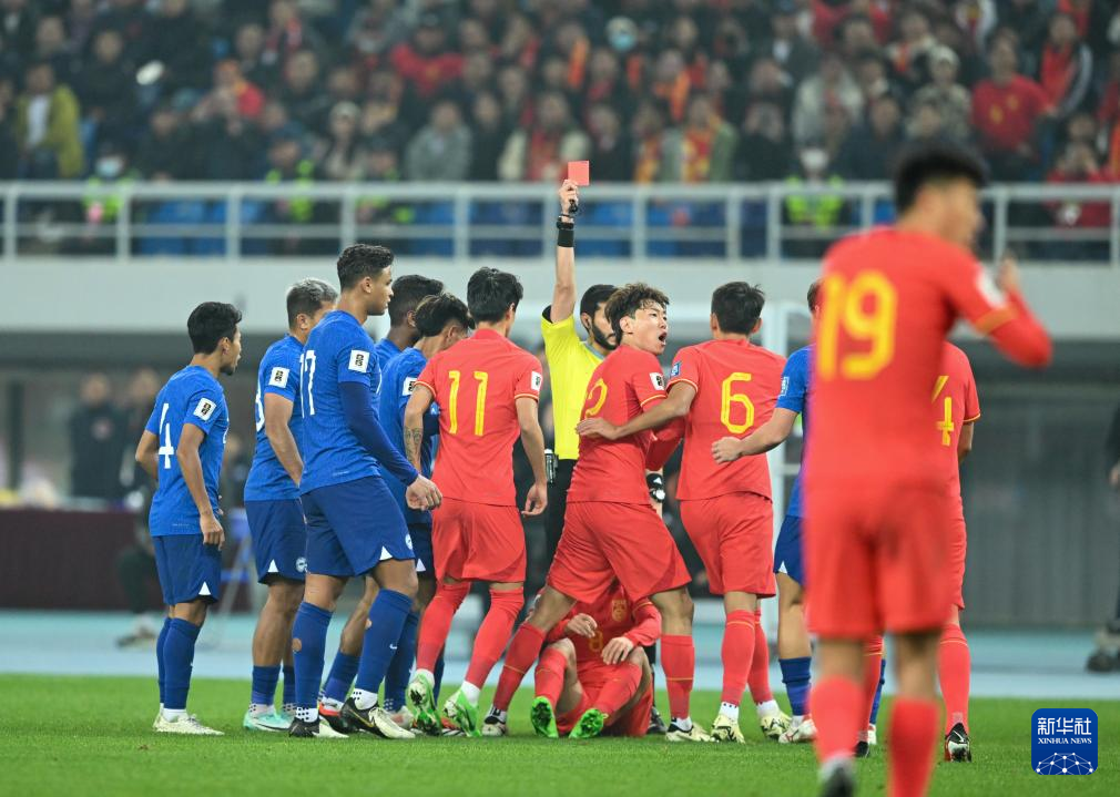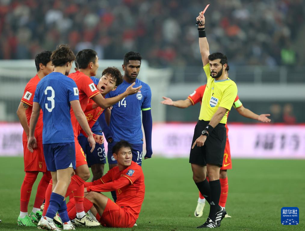3月26日,主裁判向中国队球员李源一(下)出示红牌。新华社记者 赵子硕 摄
