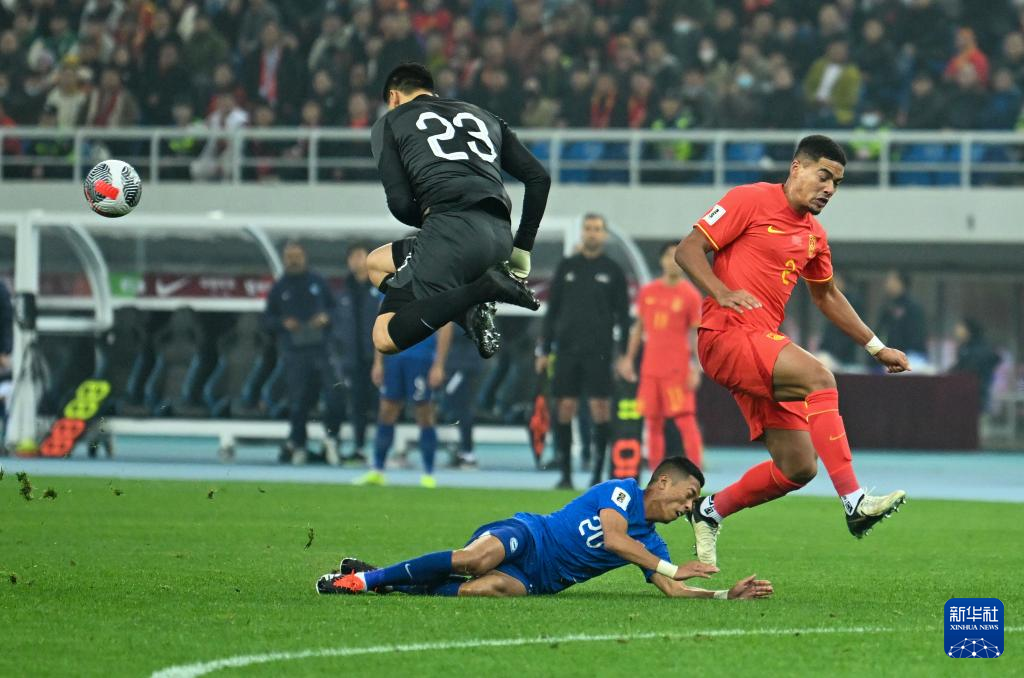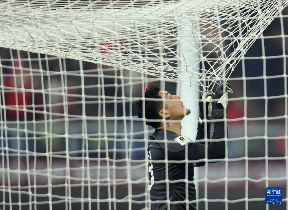 3月26日,中国队守门员王大雷在比赛中等待队友费南多主罚点球。新华社记者 贾浩成 摄