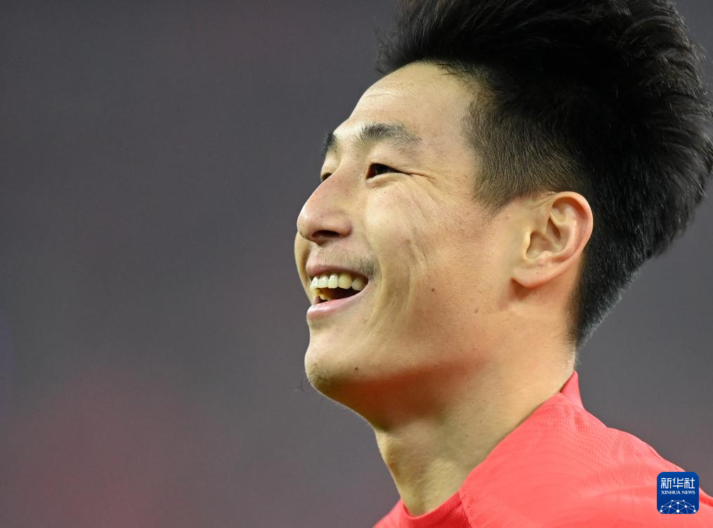 3月26日,中国队球员武磊在进球后庆祝。新华社记者 赵子硕 摄