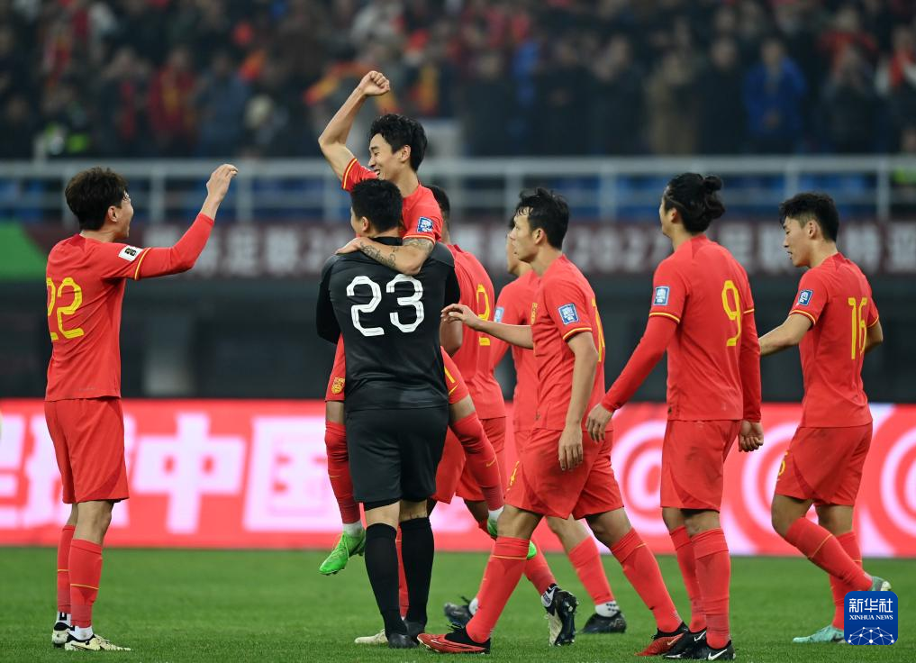 3月26日,中国队守门员王大雷(左三)与中国队球员韦世豪(左二)庆祝得分。新华社记者 孙凡越 摄