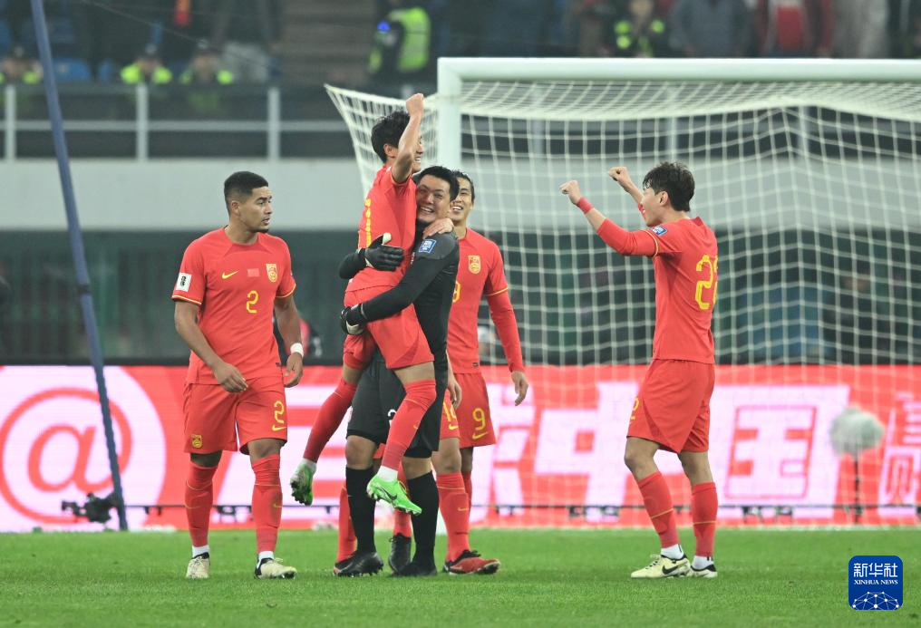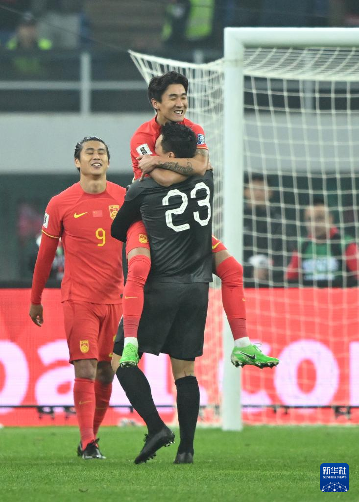 3月26日,中国队守门员王大雷(右下)与中国队球员韦世豪(右上)庆祝得分。新华社记者 孙凡越 摄
