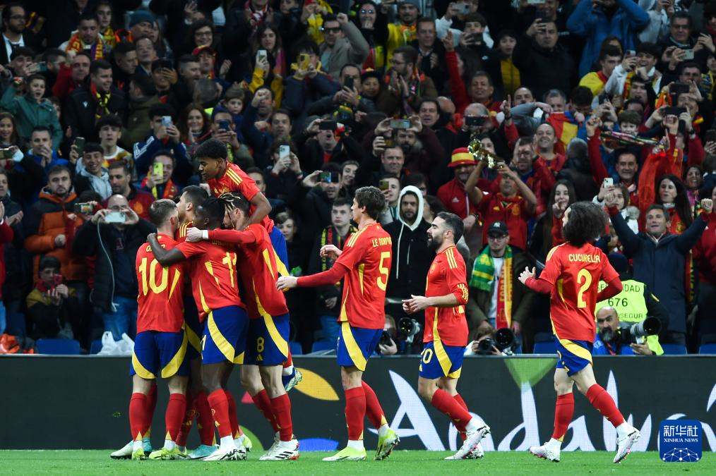 3月26日,西班牙队球员庆祝打入首粒进球。新华社发(古斯塔沃·巴连特摄)