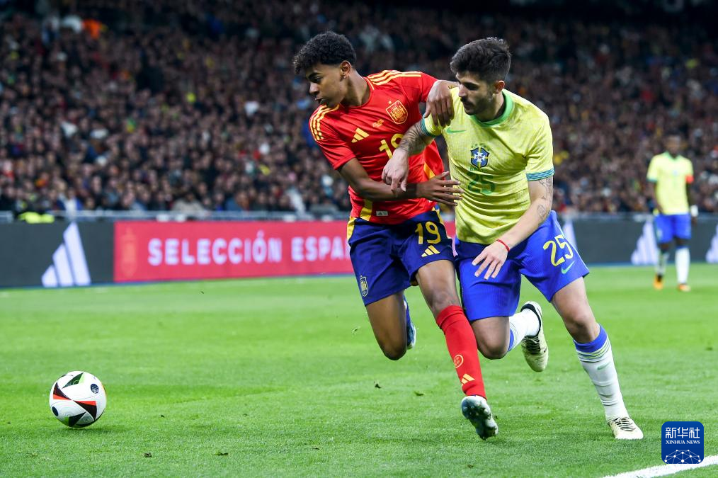 3月26日,西班牙队球员亚马尔(左)与巴西队球员贝拉尔多拼抢。新华社发(古斯塔沃·巴连特摄)