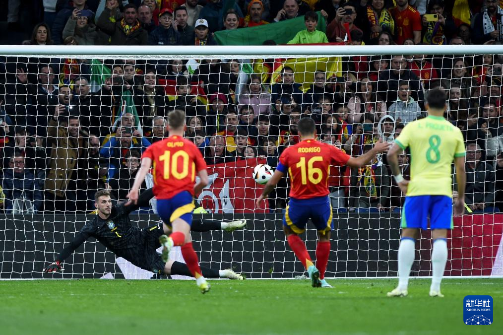 3月26日,巴西队守门员本托(左一)未能扑出西班牙队球员罗德里(右二)的射门。新华社发(古斯塔沃·巴连特摄)