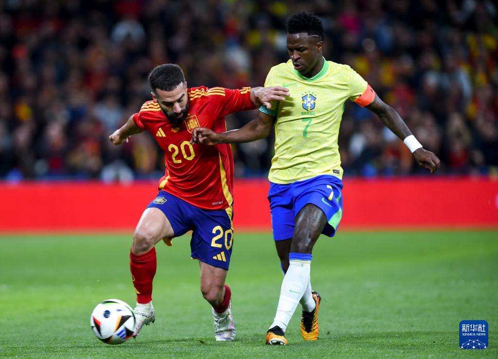 3月26日,西班牙队球员卡瓦哈尔(左)与巴西队球员维尼修斯拼抢。新华社发(古斯塔沃·巴连特摄)