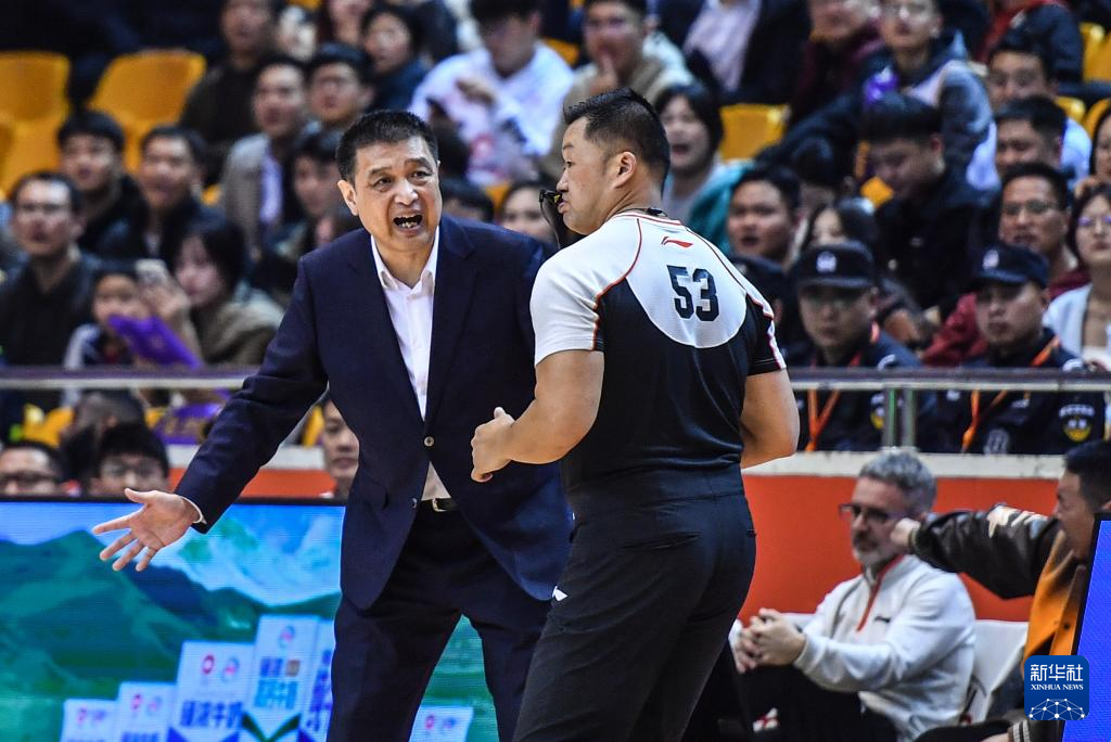 3月26日,北京控股队主教练闵鹿蕾(左)在比赛中和裁判交流。新华社记者 朱峥 摄