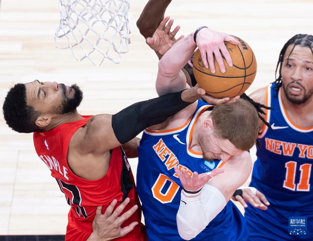 3月27日,猛龙队球员阿巴基(左)与尼克斯队球员麦克布莱德在比赛中争抢篮板球。新华社发(邹峥摄)