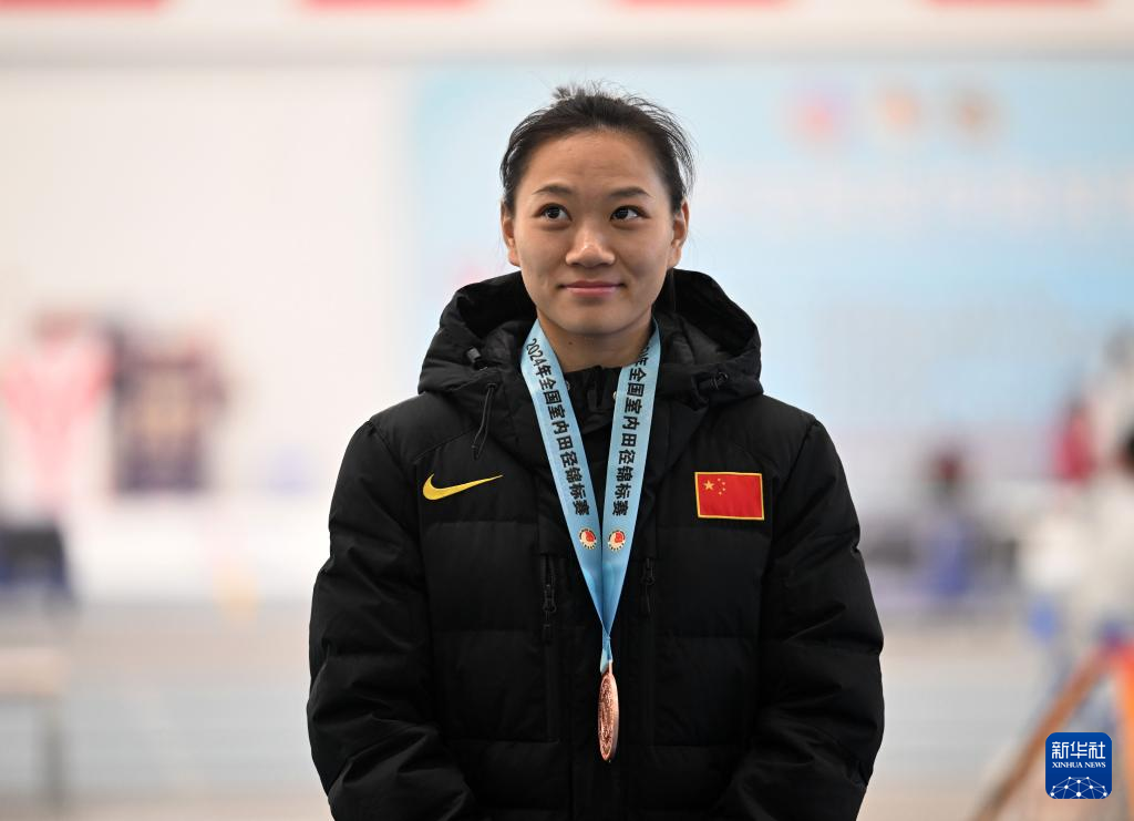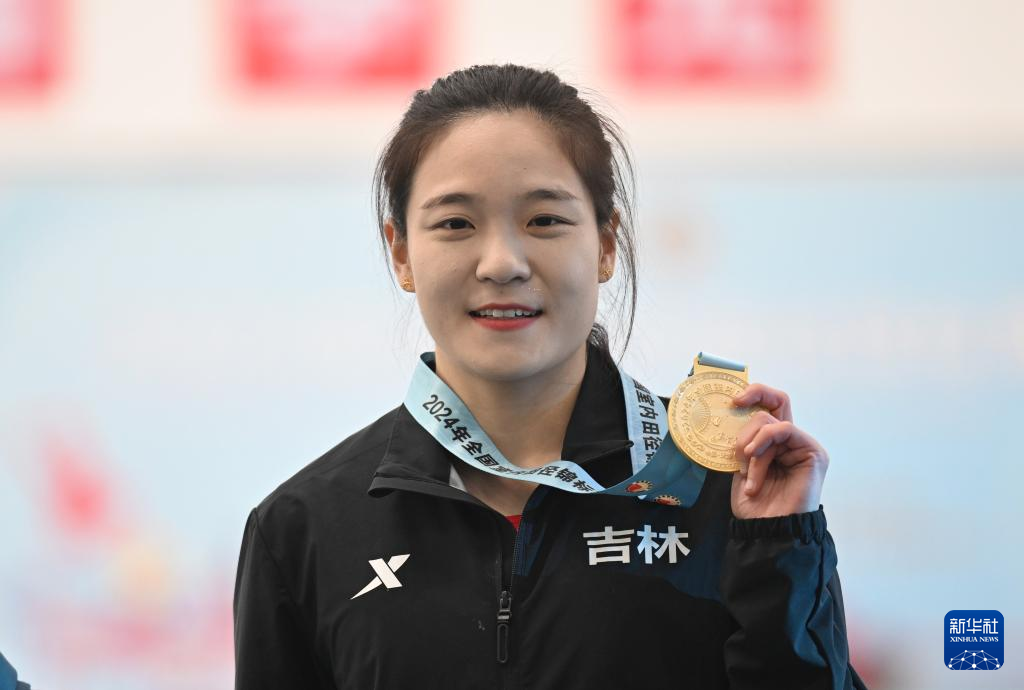 3月29日,吉林队选手郭思佳在女子跳远颁奖仪式上。她以6米36的成绩获得冠军。新华社记者 赵子硕 摄