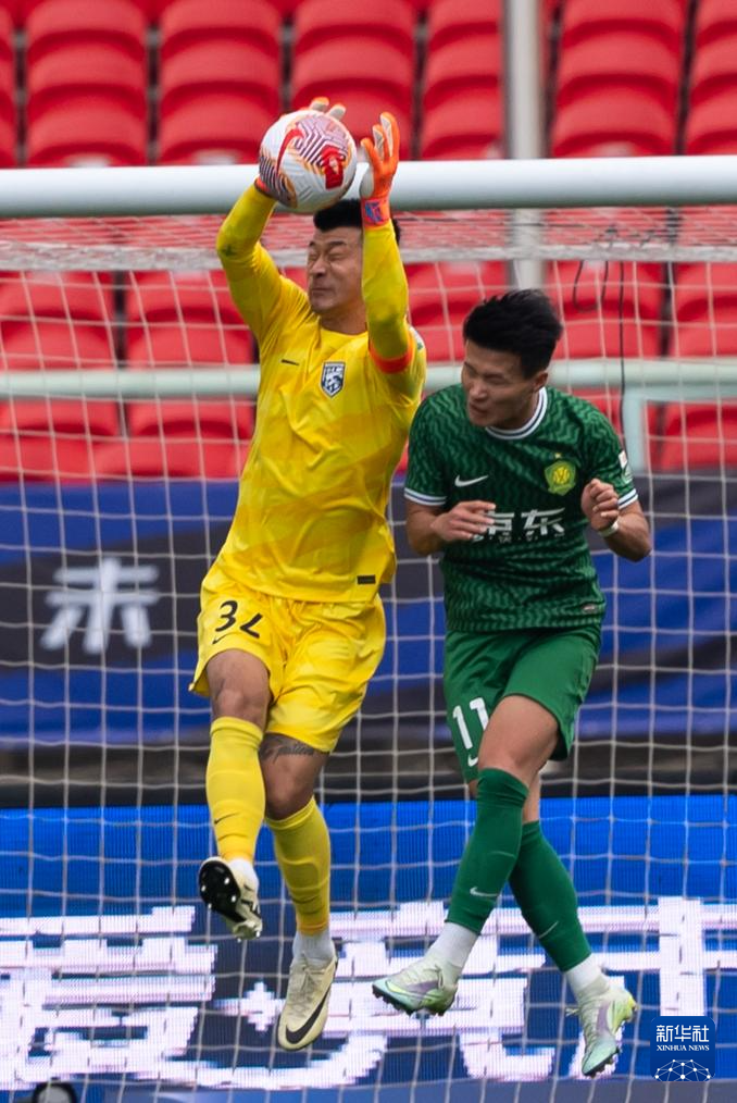 3月30日,北京国安队守门员侯森(右二)在比赛中扑救险球。新华社记者 肖艺九 摄