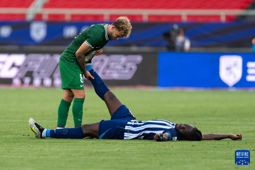 3月30日,武汉三镇队球员恩里克(右前)在比赛中摔倒。新华社记者 肖艺九 摄
