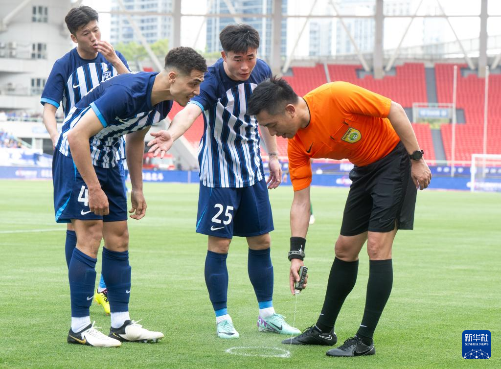 3月30日,武汉三镇队球员邓涵文(右二)在比赛中质疑裁判的任意球判罚。新华社记者 肖艺九 摄