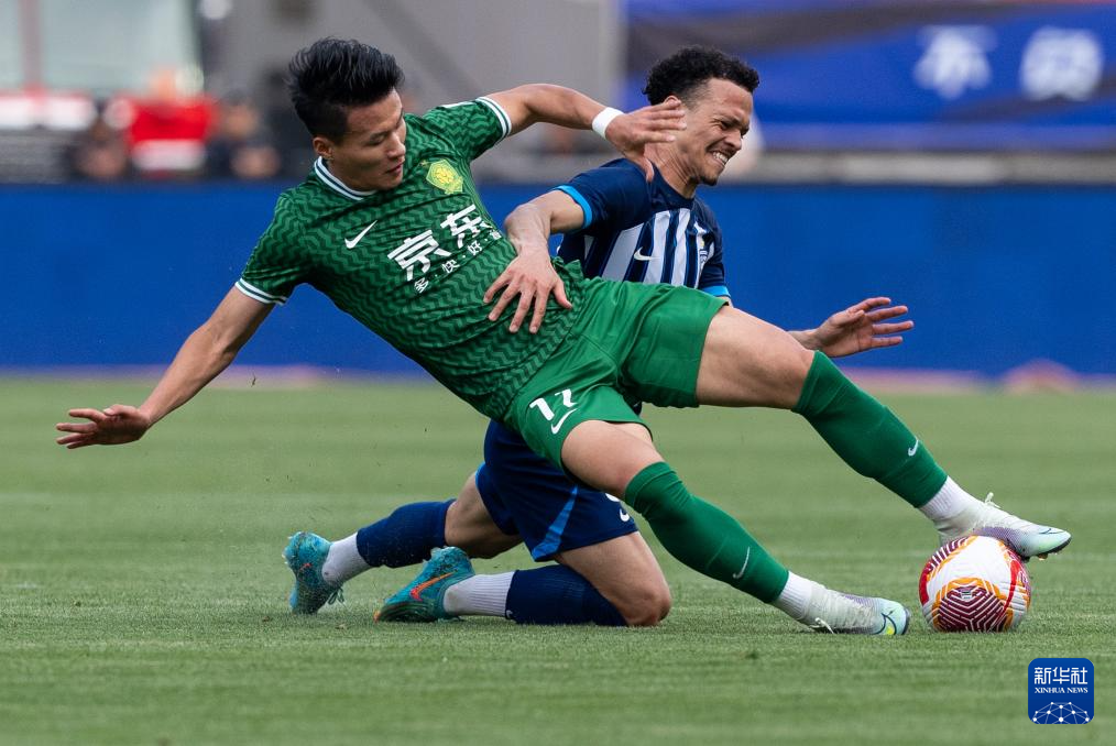 3月30日,北京国安队球员林良铭(左)与武汉三镇队球员达兰在比赛中拼抢。新华社记者 肖艺九 摄