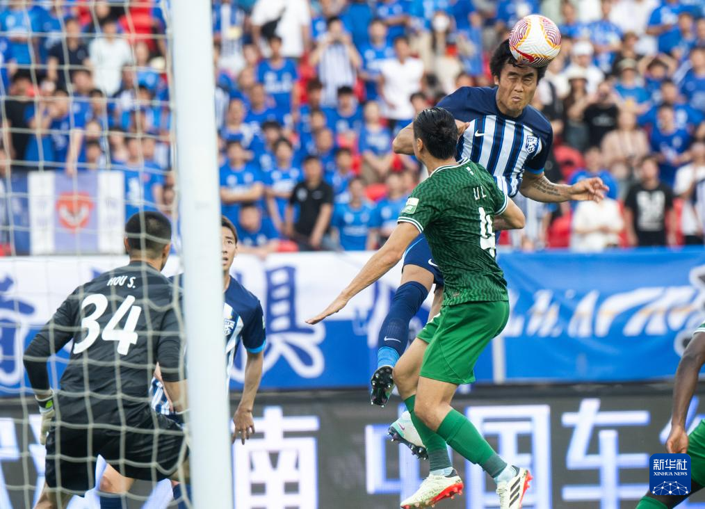 3月30日,武汉三镇队球员朴志洙(右上)在比赛中头球攻门。新华社记者 肖艺九 摄