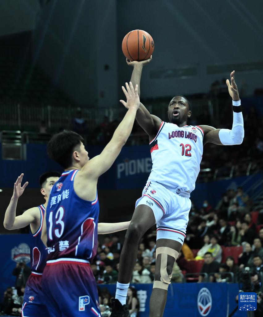 3月29日,广州龙狮队球员坎普(右)在比赛中投篮。新华社记者 孙凡越 摄
