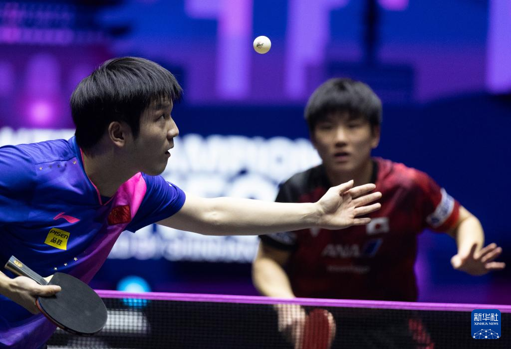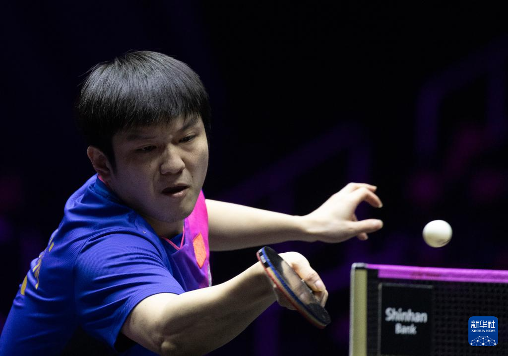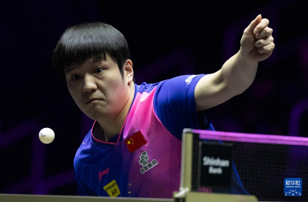 3月30日,樊振东在比赛中发球。新华社发(全休相摄)