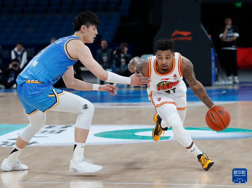 3月29日,北京北汽队球员曾凡博(左)在比赛中防守吉林九台农商银行队球员皮特森。新华社记者 雒圆 摄