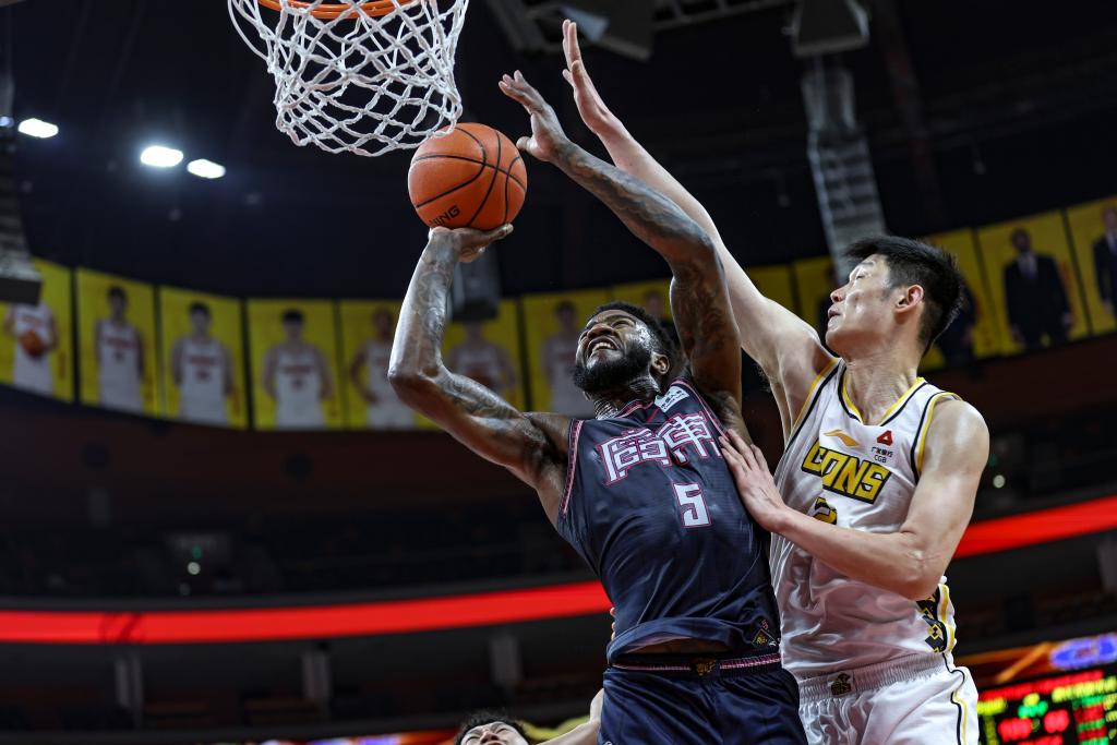 3月29日,广东队球员贝尔(左)在比赛中上篮。新华社发(郑家雄摄)