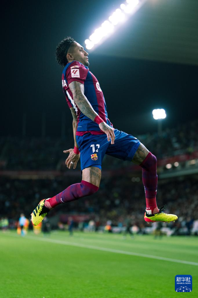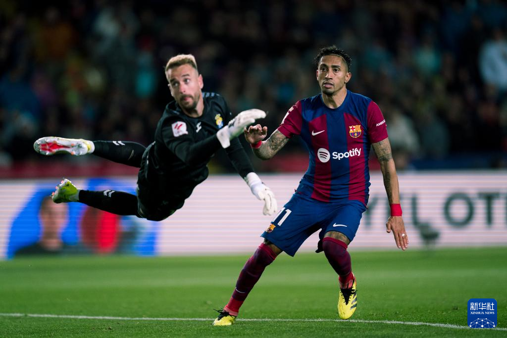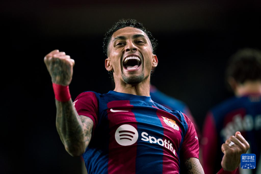 3月30日,巴塞罗那队球员拉菲尼亚庆祝进球。