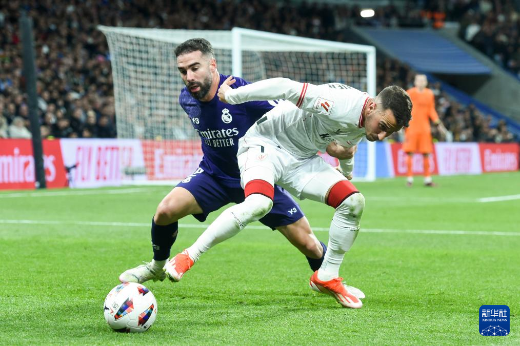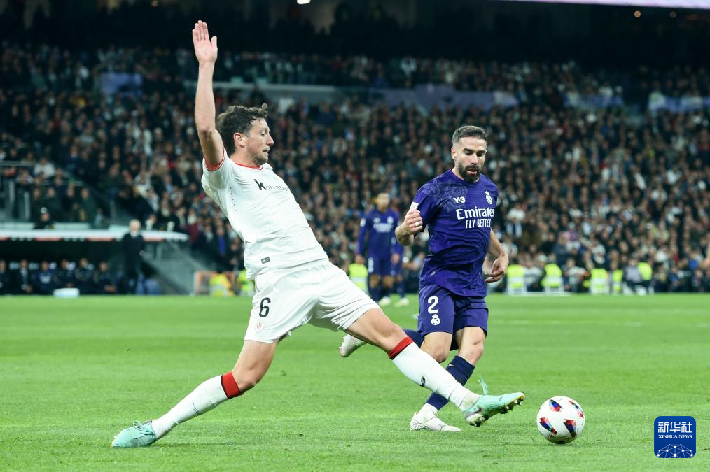 3月31日,皇家马德里队球员卡瓦哈尔(右)与毕尔巴鄂竞技队球员贝斯加拼抢。新华社发(古斯塔沃·巴连特摄)