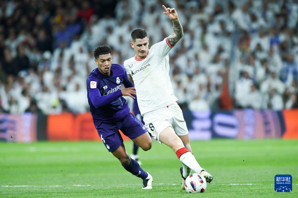 3月31日,皇家马德里队球员贝林厄姆(左)与毕尔巴鄂竞技队球员桑切特拼抢。新华社发(古斯塔沃·巴连特摄)