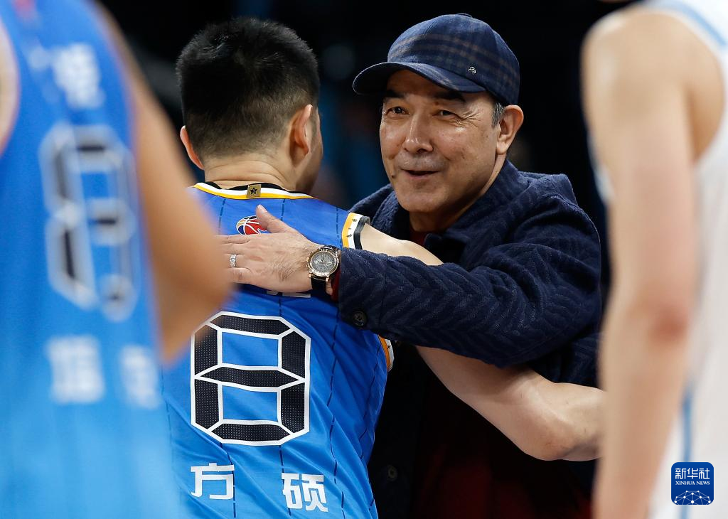 3月31日,宁波町渥队主教练阿的江(右)在比赛后与北京北汽队球员方硕拥抱致意。新华社记者 王丽莉 摄