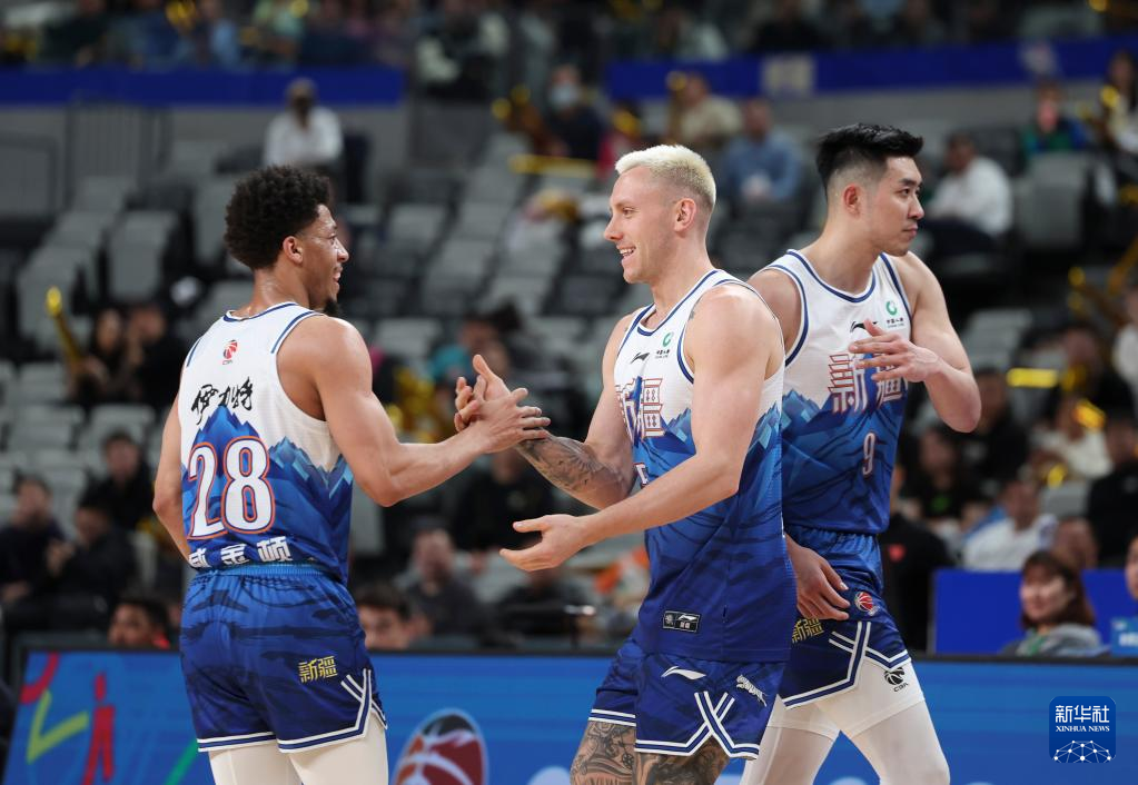 3月31日,新疆伊力特队球员克里克(中)与队友吴冠希(右)、威金顿庆祝。新华社记者 胡虎虎 摄