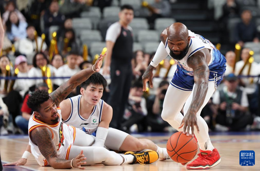 3月31日,新疆伊力特队球员琼斯(右)、于德豪(中)与吉林九台农商银行队球员皮特森在比赛中争抢。新华社记者 胡虎虎 摄