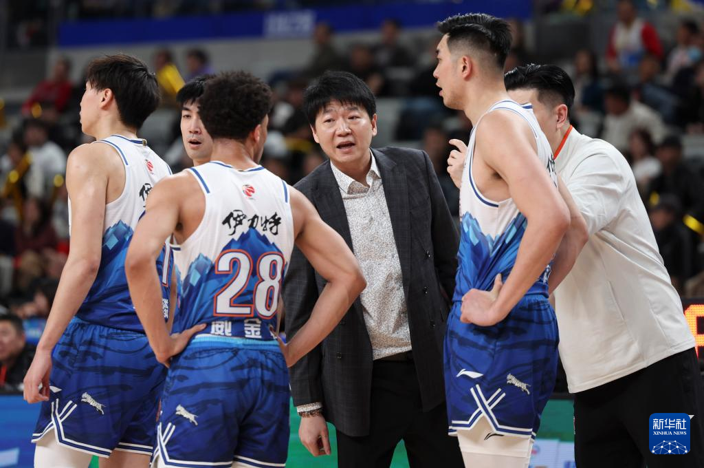 3月31日,新疆伊力特队主教练邱彪(中)在场边与队员交流。新华社记者 胡虎虎 摄