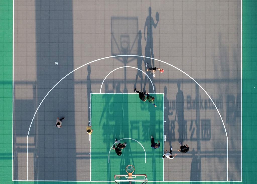 2022年4月19日,市民在石家庄市长安区裕彤国际体育中心西广场篮球公园球场打篮球(无人机照片)。新华社记者 骆学峰 摄