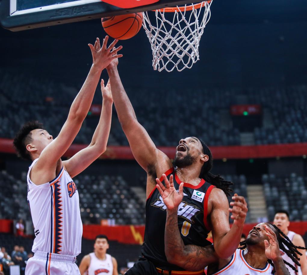 4月1日,深圳队球员萨林杰(中)在比赛中上篮。新华社发(彭志刚 摄)