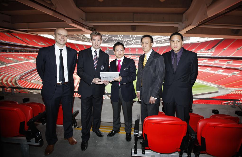 资料图:2012年5月14日,负责合作事宜的英足总教育机构负责人杰米·霍钦(左二)与孙中山青少年基金会执行总裁(CEO)郑少强(中)等在达成合作协议后在温布利球场合影。新华社记者 王丽莉 摄